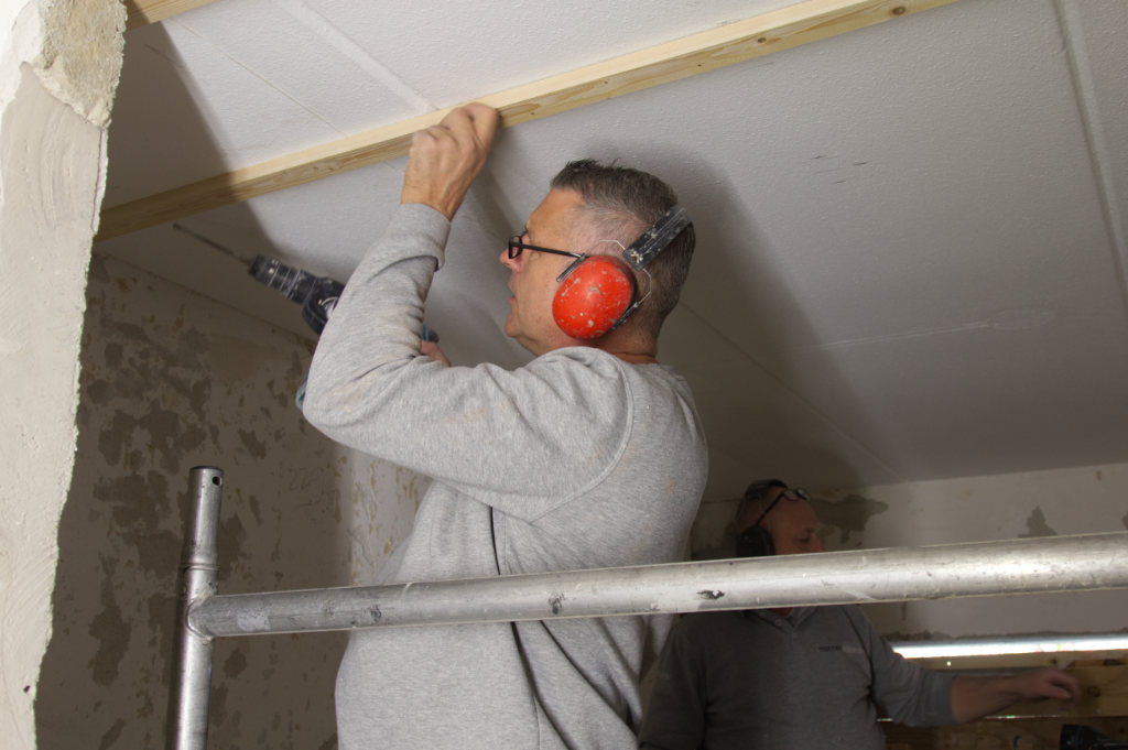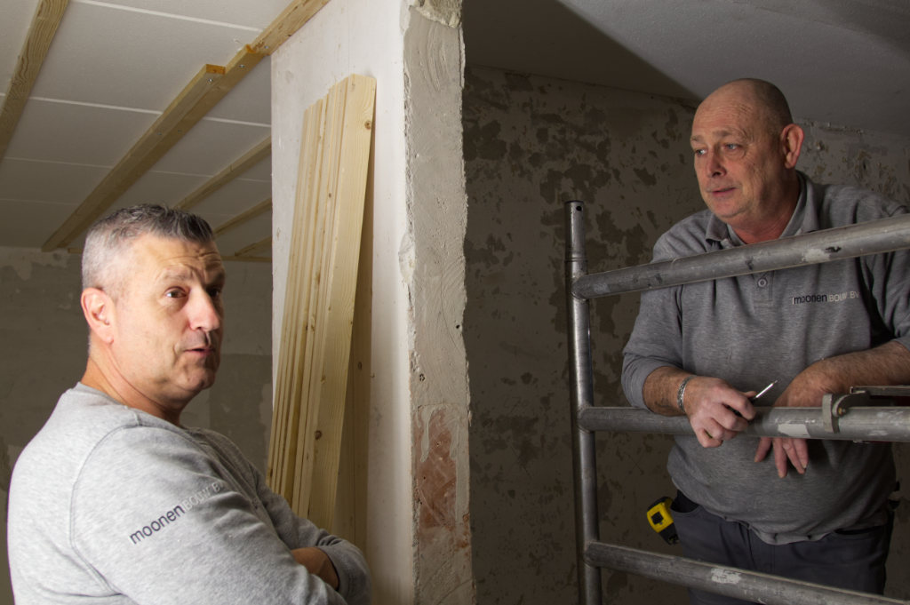 “Ik wil me meer en meer als all-rounder ontwikkelen, daarin zoek ik de uitdagingen, want als tegelzetter heb ik niet veel uitdagingen meer”, zegt Luc lachend. Ondertussen loopt Serge langs en op de vraag waarom hij Luc heeft aanbevolen bij Rob is Serge duidelijk: “Het is gewoon een fijne vent, een vakman en we hebben jaren fijn samengewerkt en nu ook weer.” Serge gaat verder op de badkamer met het plaatsen van rachels voor het plafond in de douche en Luc klimt op de ladder om hem te helpen. Serge boort en Luc slaat de pluggen erin. Want voorlopig is er nog niks te betegelen…