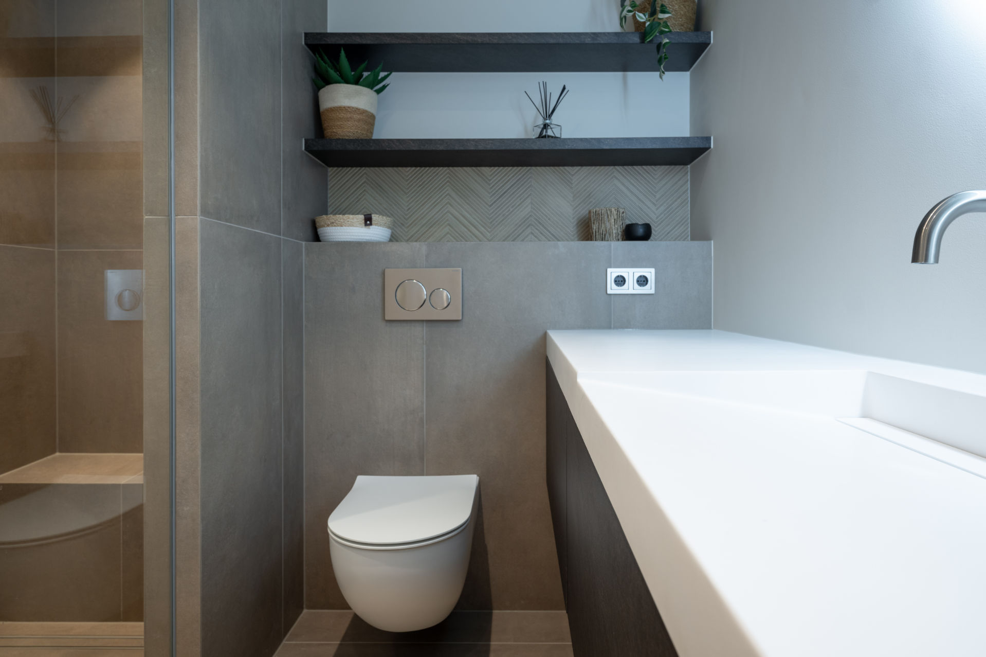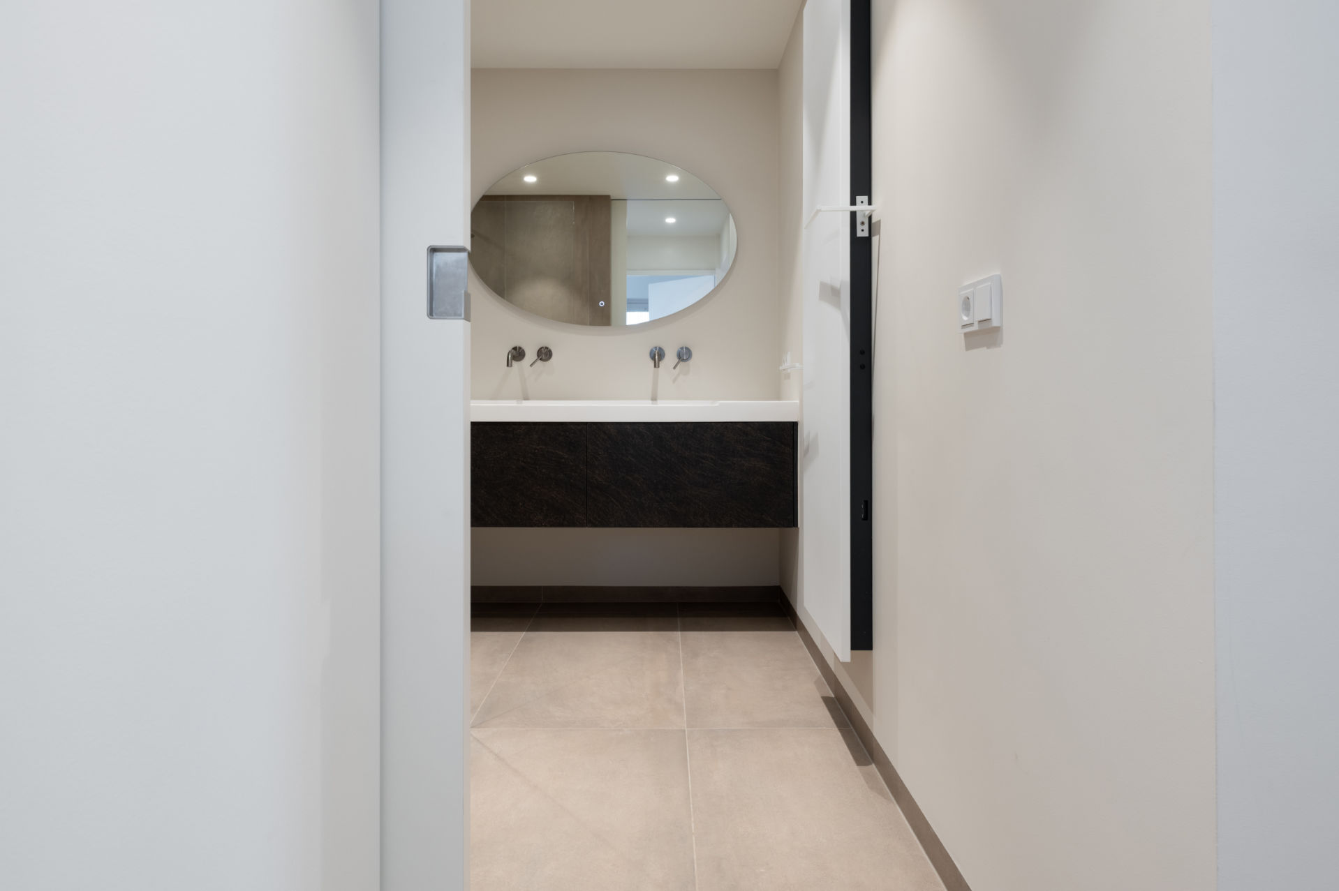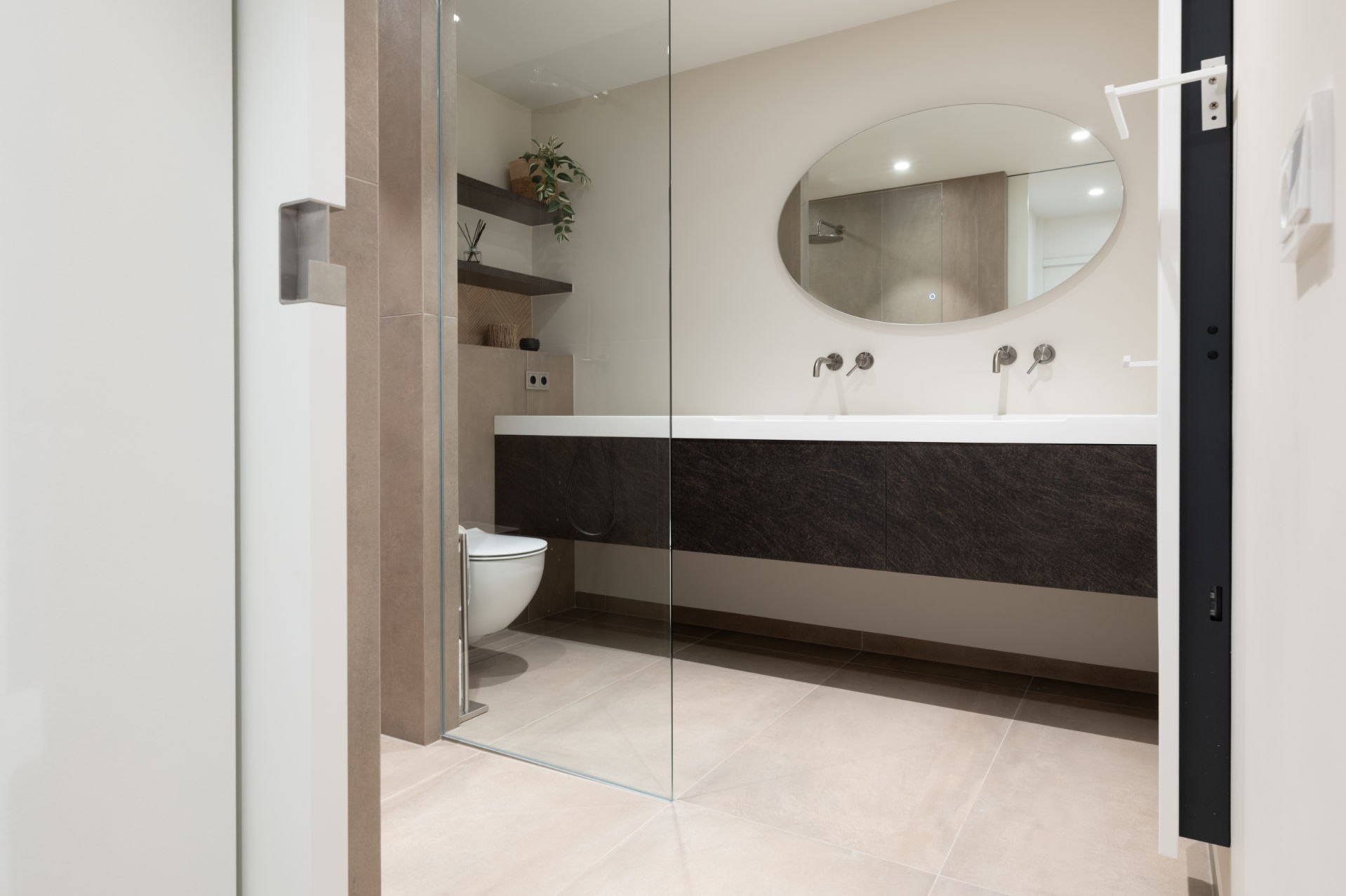 Bij deze levensloopbestendige woning in Klimmen hebben wij de badkamer en het toilet volledig gemoderniseerd. Daarnaast is de indeling van de badkamer aanzienlijk functioneler gemaakt, onder andere door het toepassen van een weggewerkte schuifdeur, een inloopdouche, een vrij hangend toilet en een stijlvol meubel.