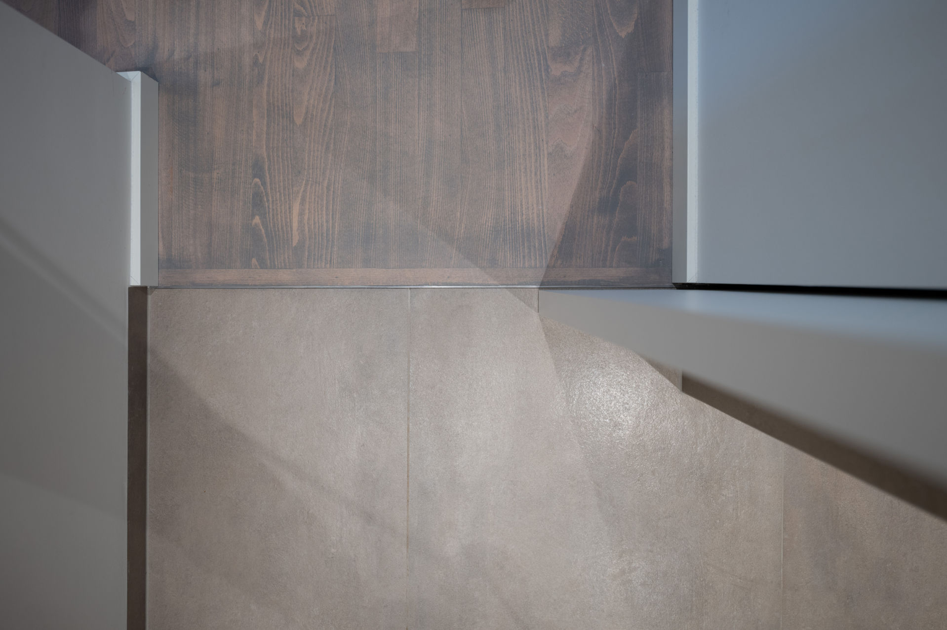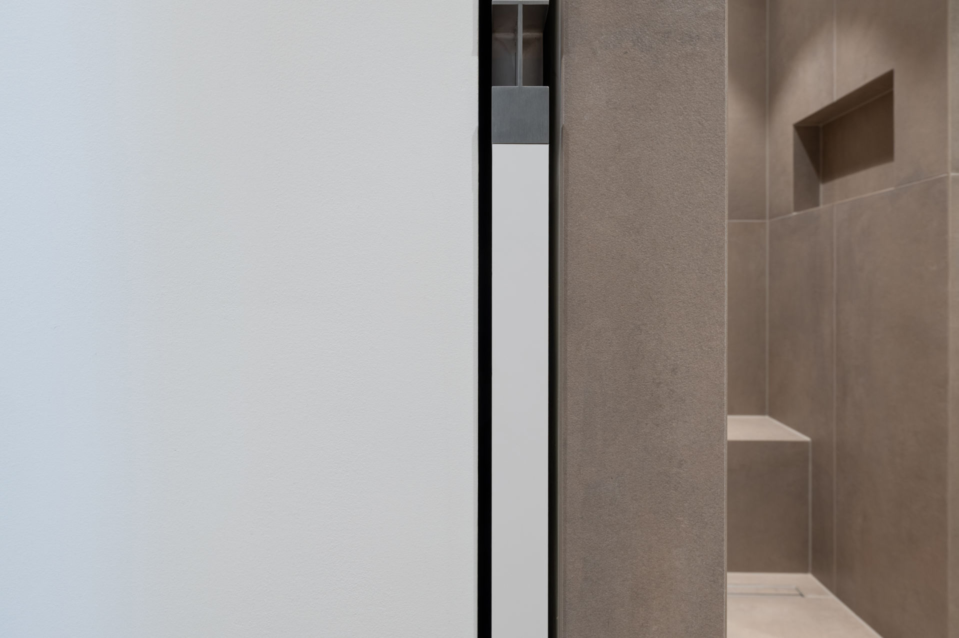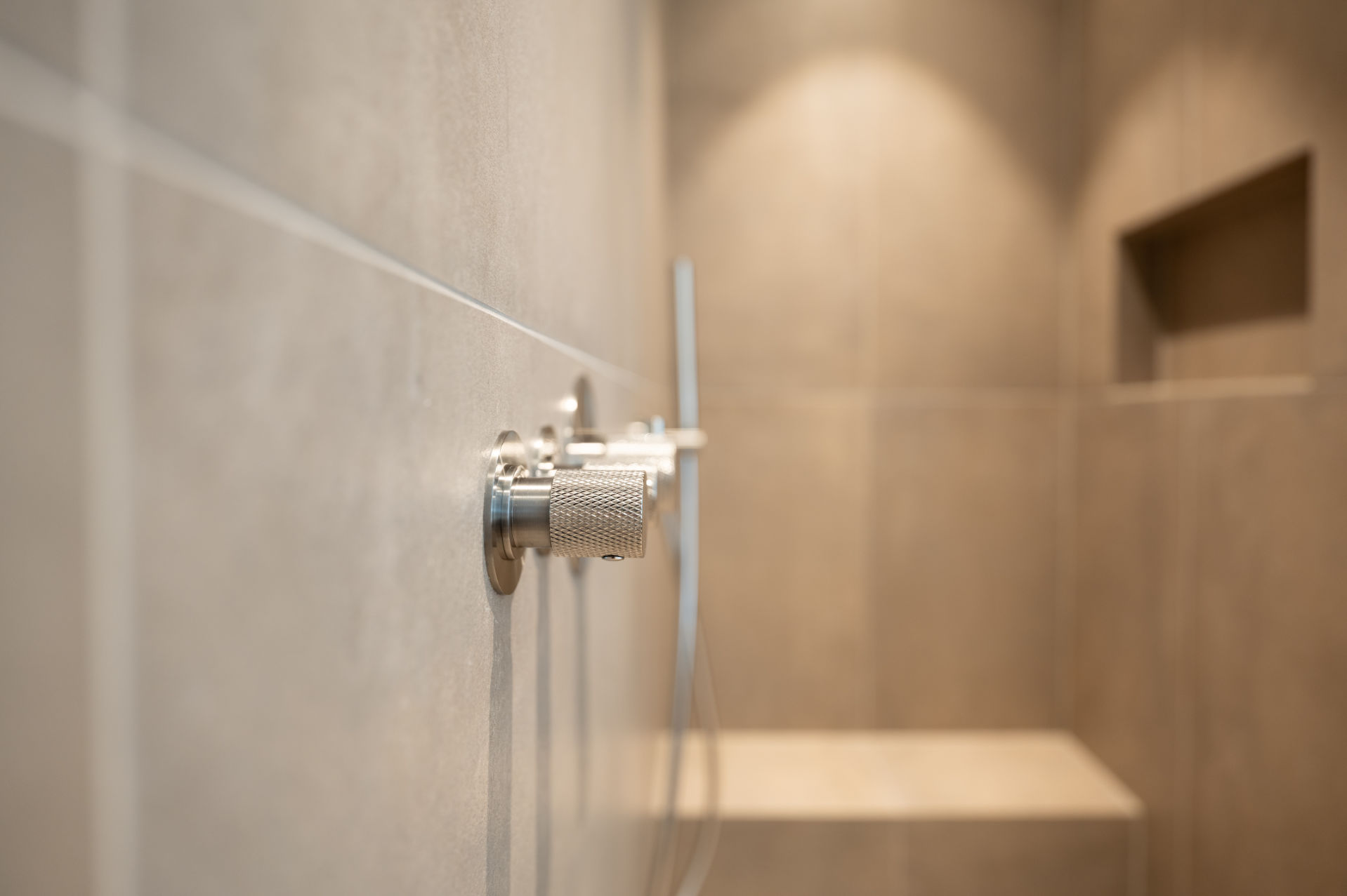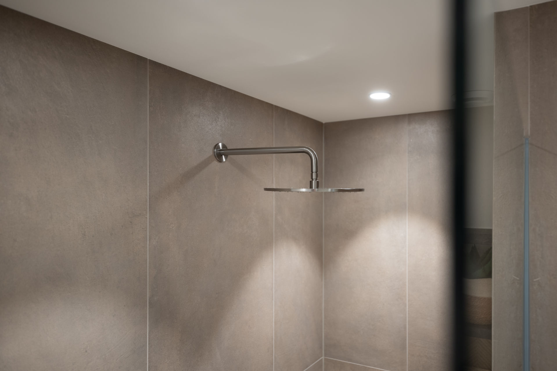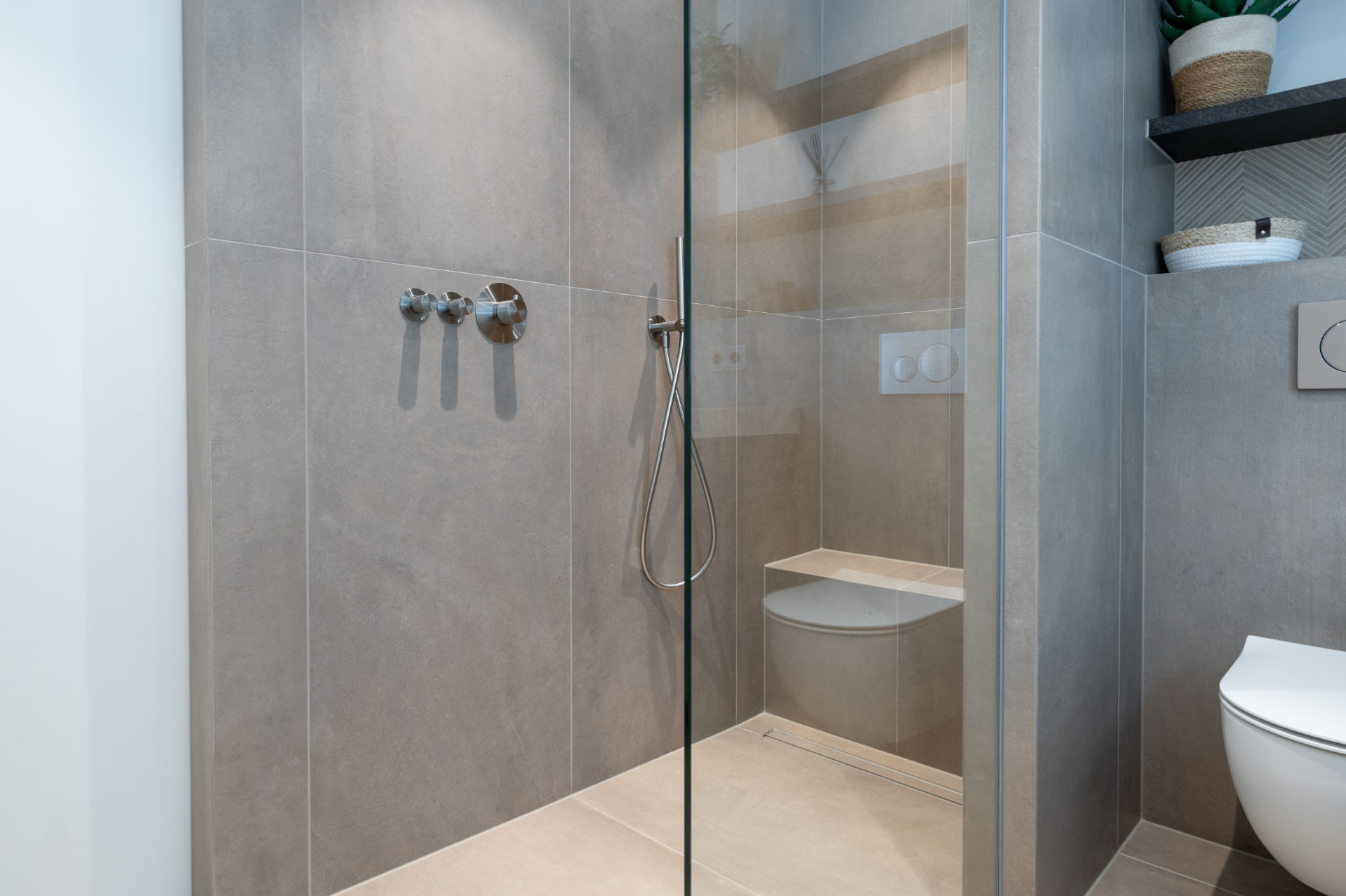 De ruime inloopdouche is voorzien van een zitplateau en een ingebouwde nis als praktische afstel ruimte. Alle uitwendige hoeken zijn onder verstek en subtiel afgewerkt. De glazen wand versterkt het ruimtelijke effect van de douche.
