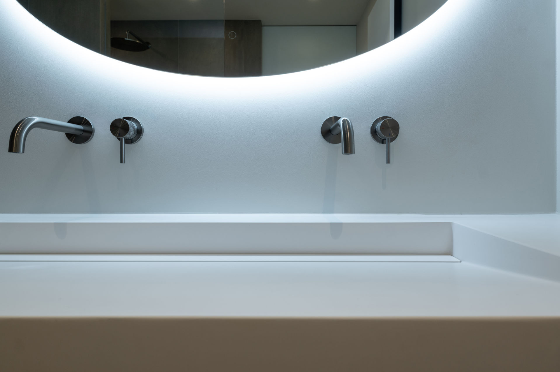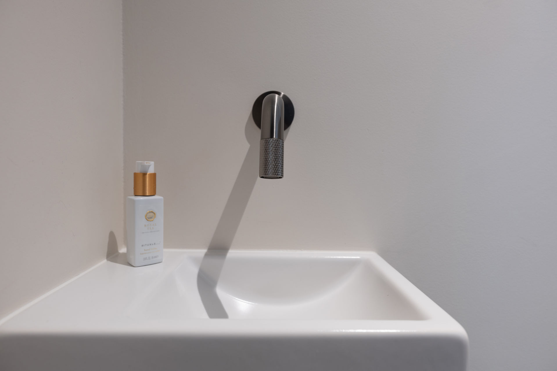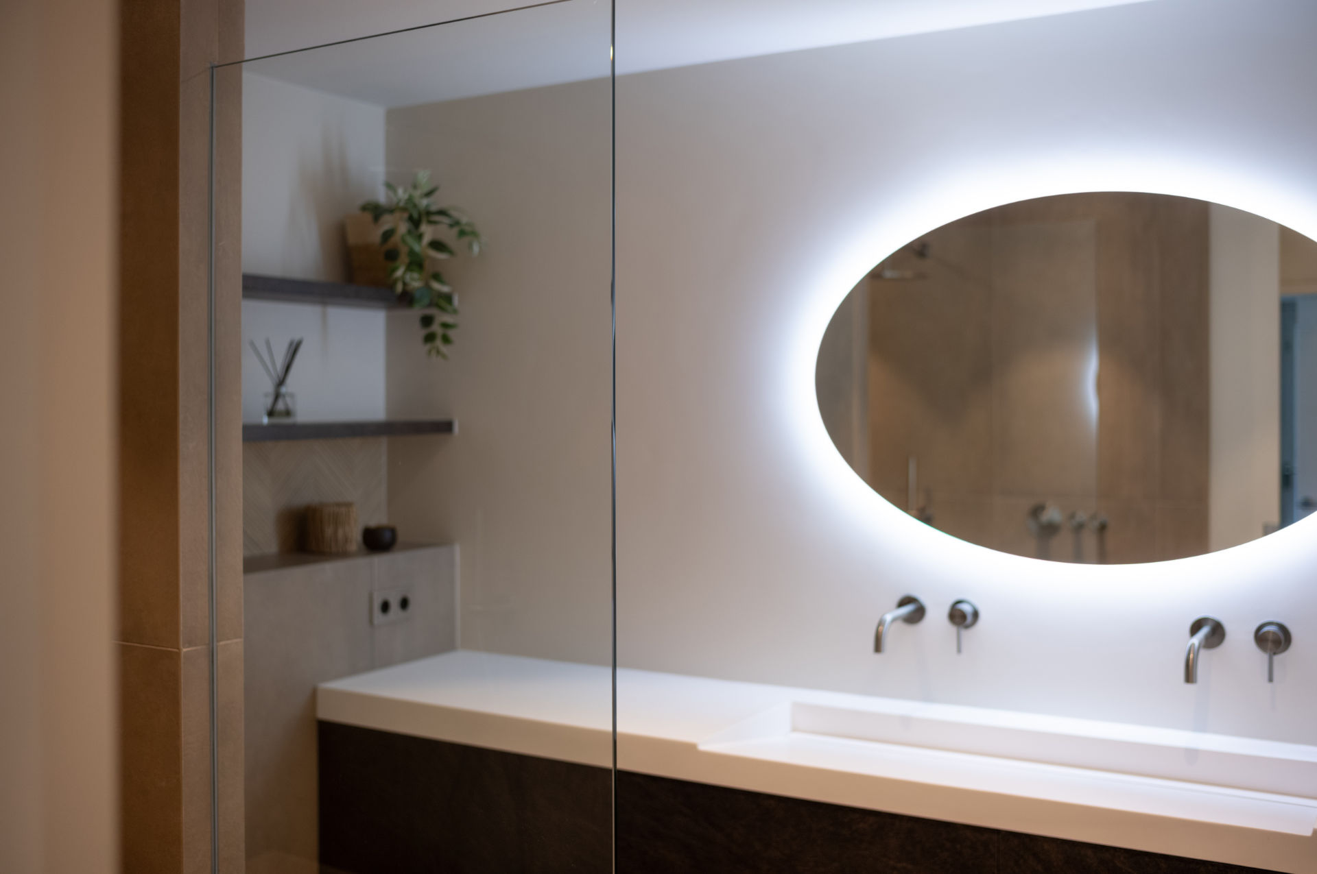 Het vrij hangende meubel, uitgevoerd met een Hi-Macs blad en een geïntegreerde wasbak, wordt gecombineerd met een royale spiegel, wat zorgt voor een rustige en ruimtelijke uitstraling. De combinatie van gestucte wanden met een ingebouwde plint en betegelde wanden zorgt voor een mooie balans in materiaalgebruik. De geborstelde rvs-inbouwkranen van het merk Brauer maken het geheel compleet.