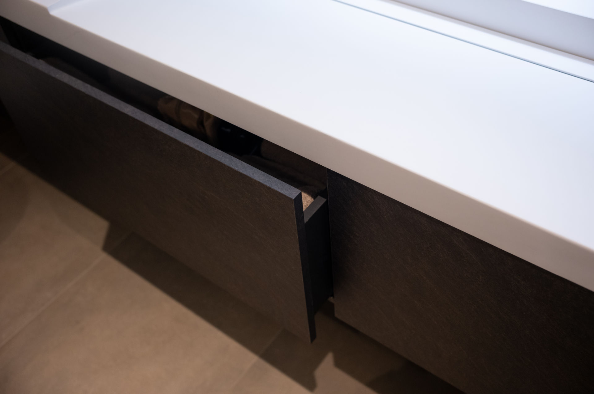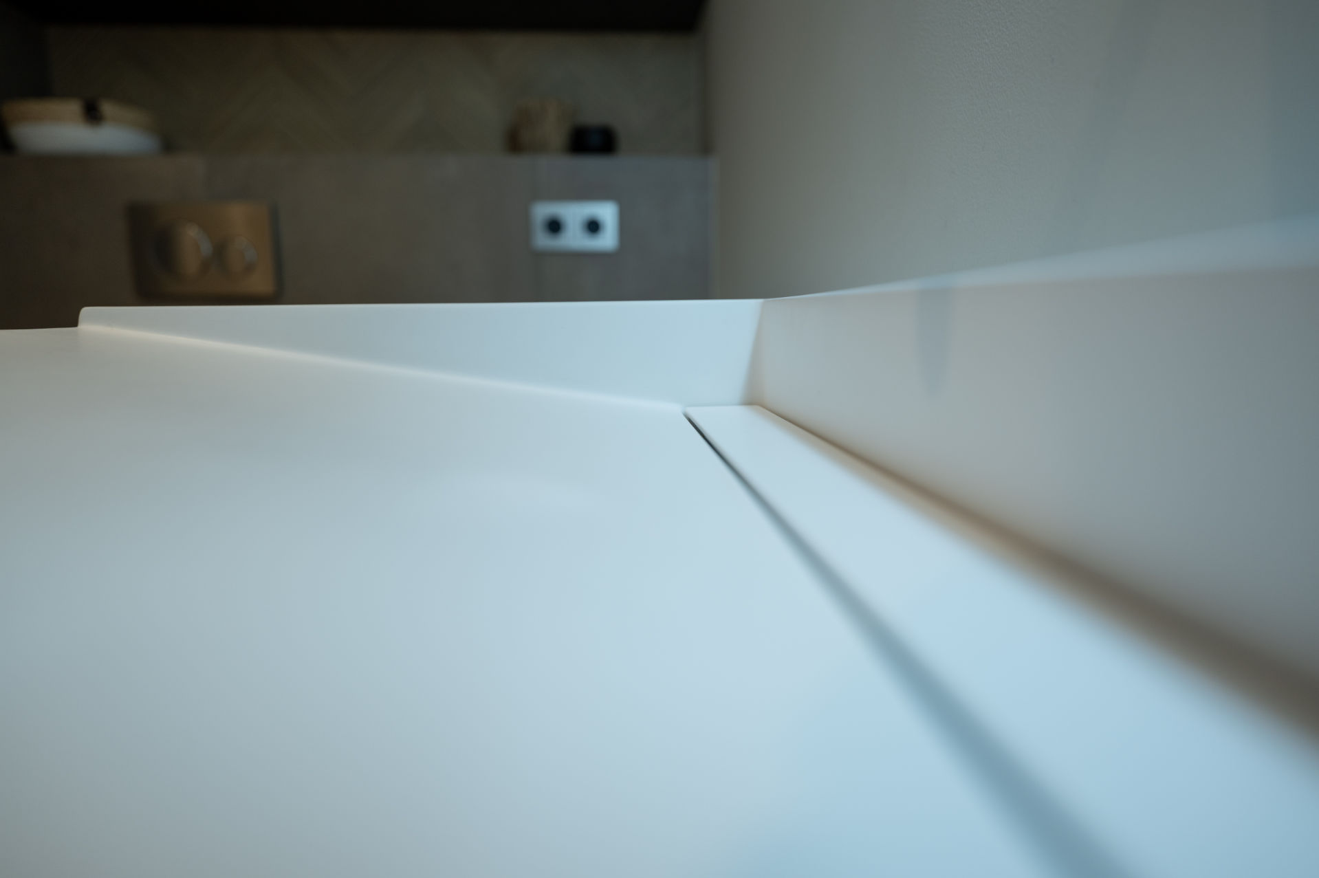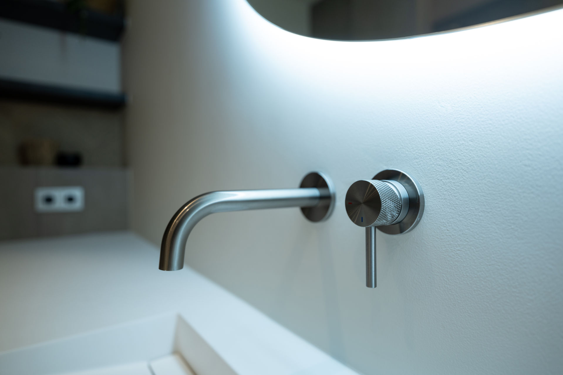 Het vrij hangende meubel, uitgevoerd met een Hi-Macs blad en een geïntegreerde wasbak, wordt gecombineerd met een royale spiegel, wat zorgt voor een rustige en ruimtelijke uitstraling. De combinatie van gestucte wanden met een ingebouwde plint en betegelde wanden zorgt voor een mooie balans in materiaalgebruik. De geborstelde rvs-inbouwkranen van het merk Brauer maken het geheel compleet.