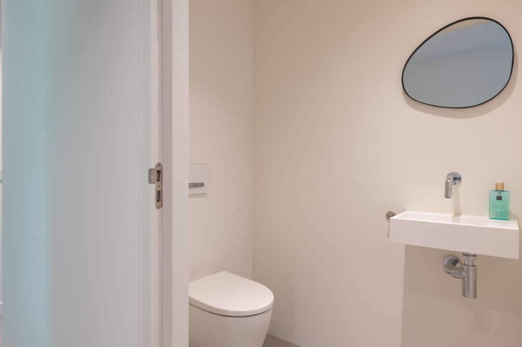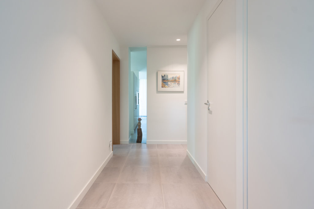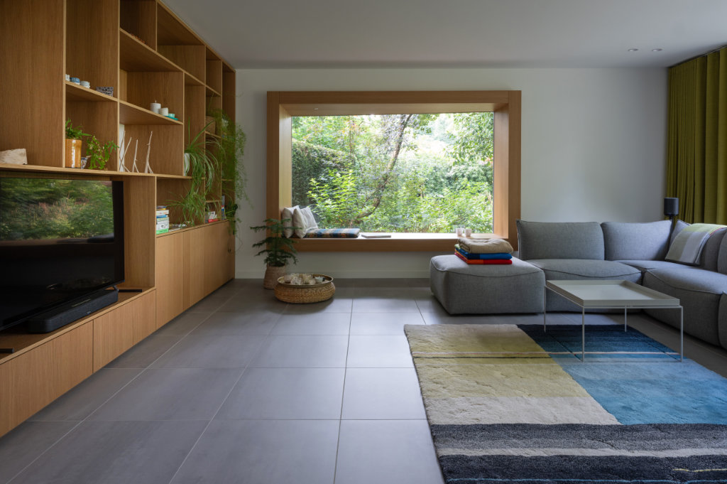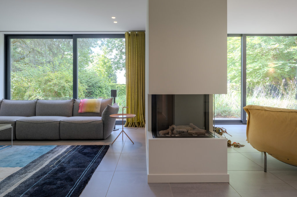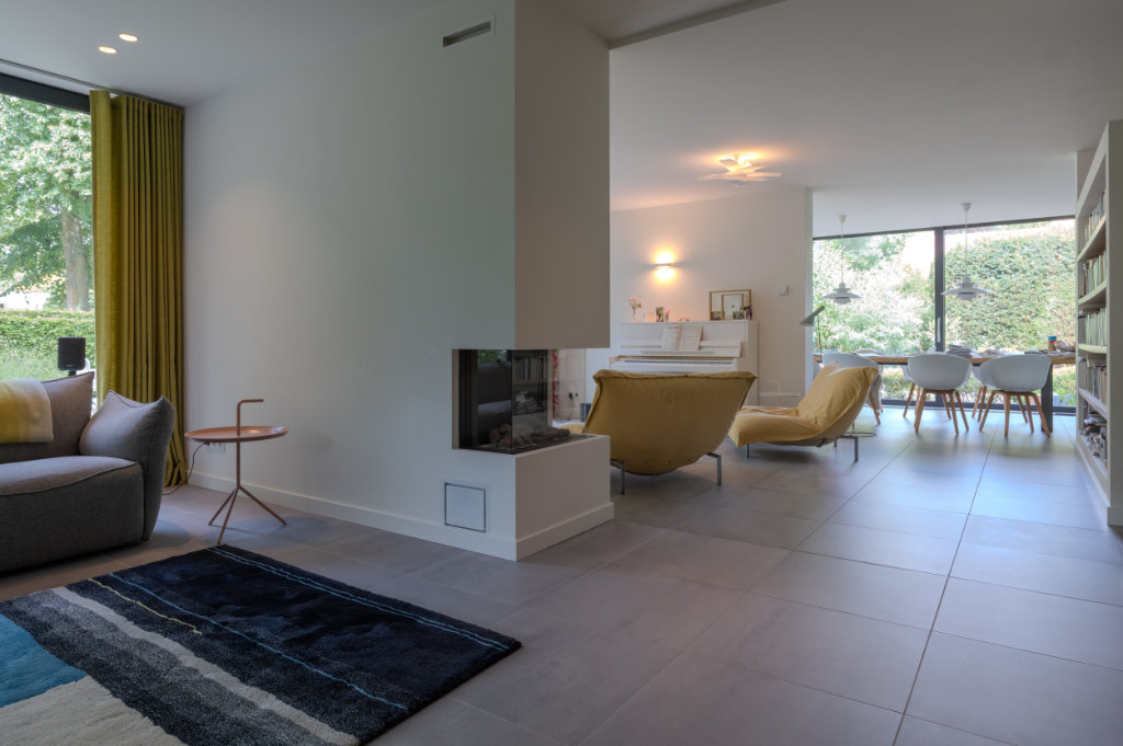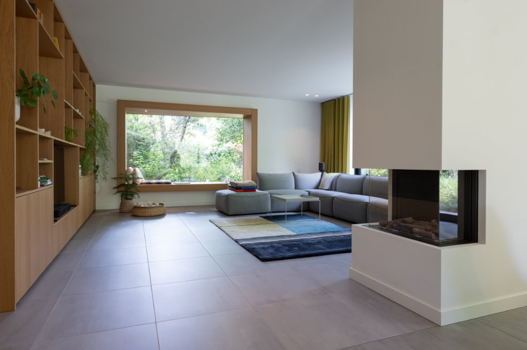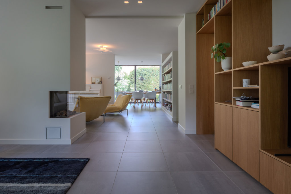 Binnen hebben we de tegelvloer uit de oorspronkelijke aanbouw kunnen nabestellen bij Mosa, waardoor de vloer nu naadloos doorloopt van entree naar woonkamer. Tegelijk is de ruimte voorzien van vloerverwarming en is er een nieuw lichtplan geïmplementeerd.