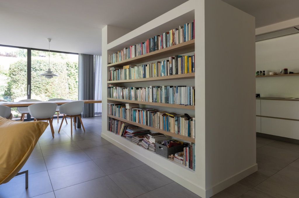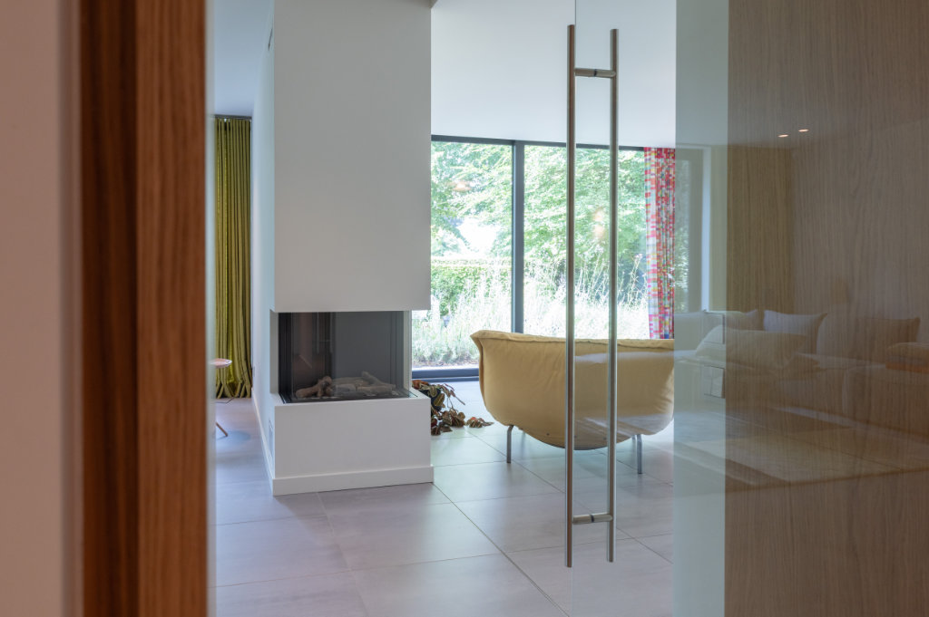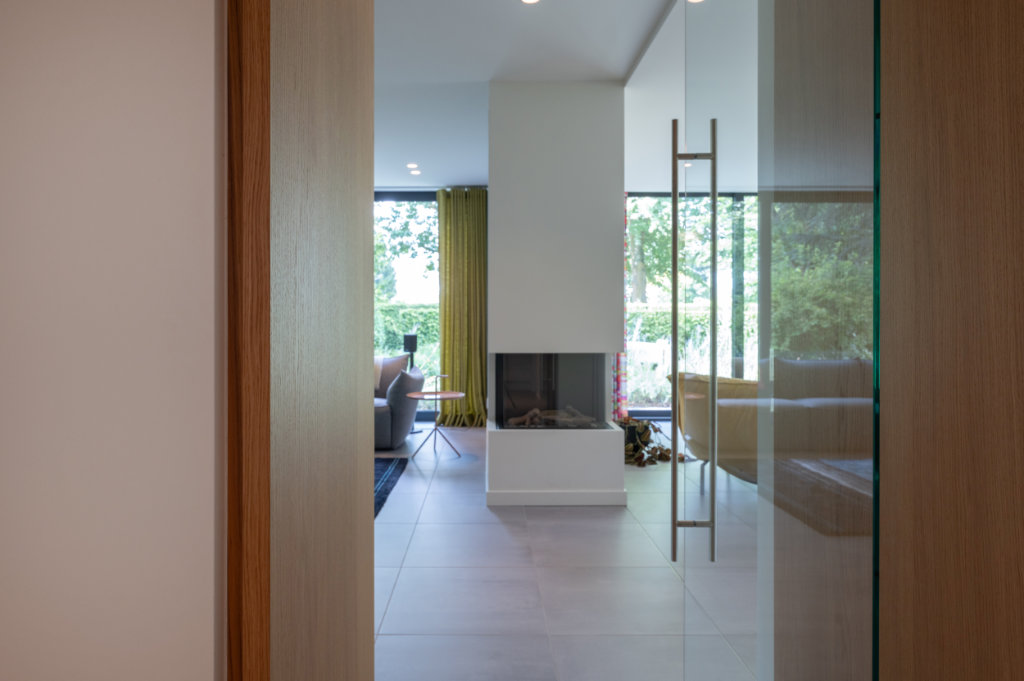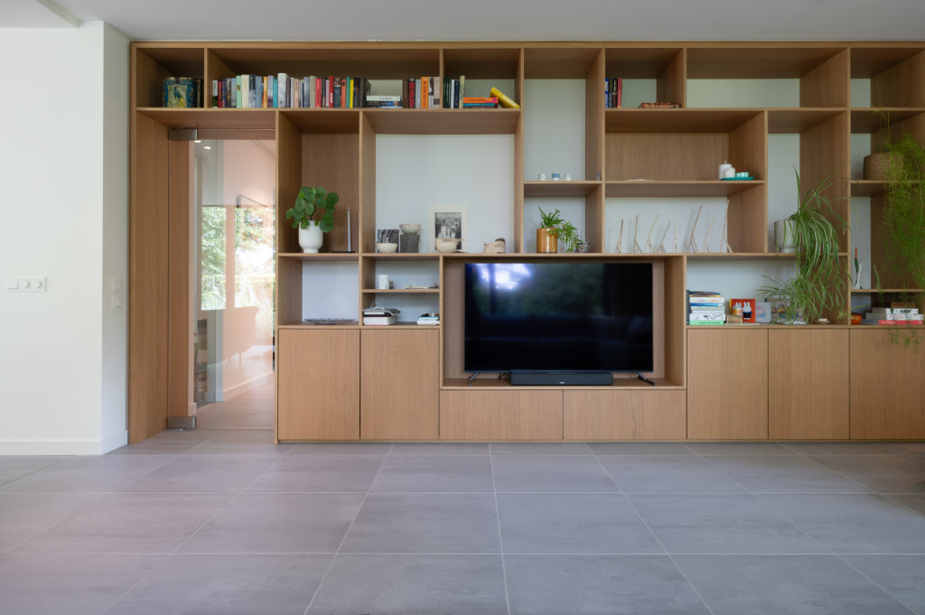 De voorheen weinig gebruikte toegang van de entree naar de woonkamer is vervangen door een glazen deur geïntegreerd een maatwerk kastenwand – ontworpen en gerealiseerd door Slangen Interieurs. Dit geheel vormt nu een sfeervolle overgang naar de zithoek met TV en versterkt de verbinding tussen interieur en exterieur.