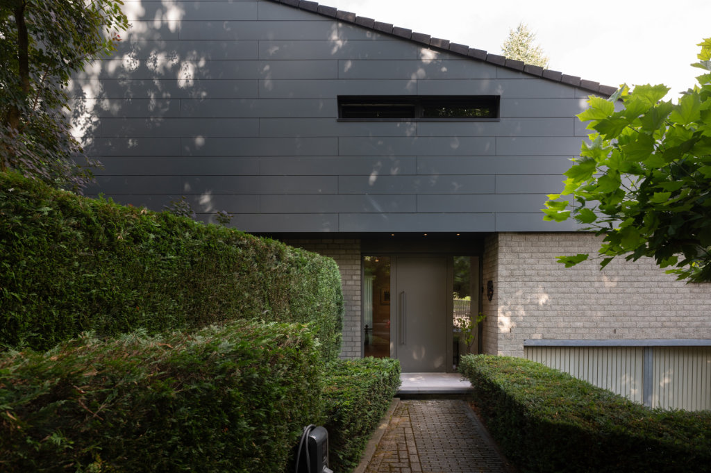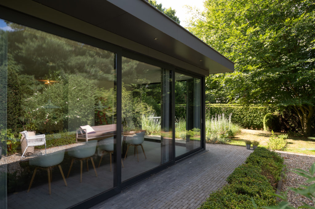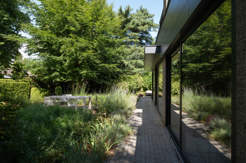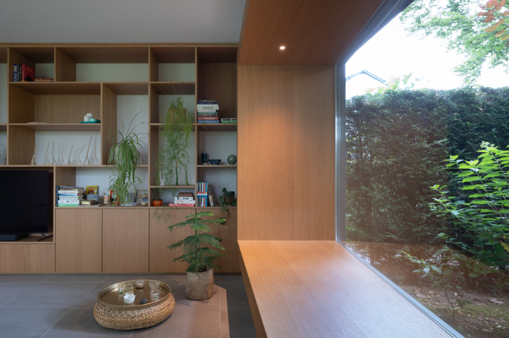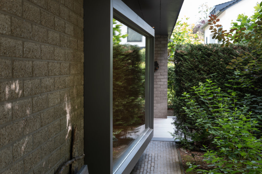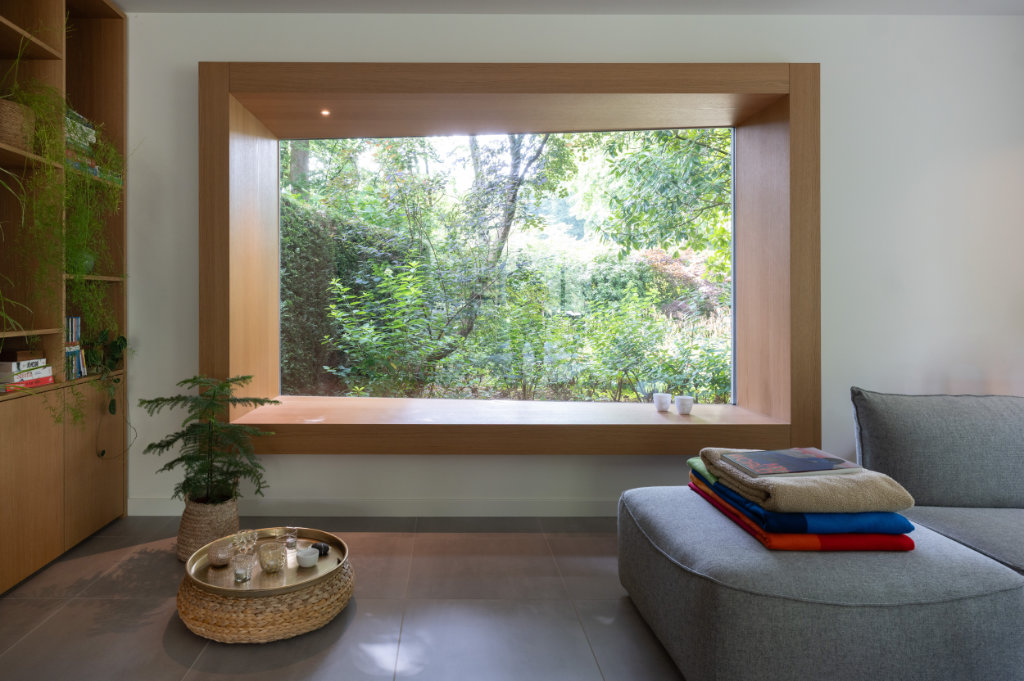 Een bijzonder element is het zogenaamde ‘bloemenraam’: een schuin in de gevel geplaatst raam dat uitnodigt om te zitten, te genieten van het uitzicht en een directe verbinding met de tuin creëert. Aan de buitenzijde is dit raam voorzien van een op maat ontworpen aluminium zetwerk en aan de binnenzijde afgewerkt met een stijlvolle eikenhouten lijst van Slangen Interieurs.